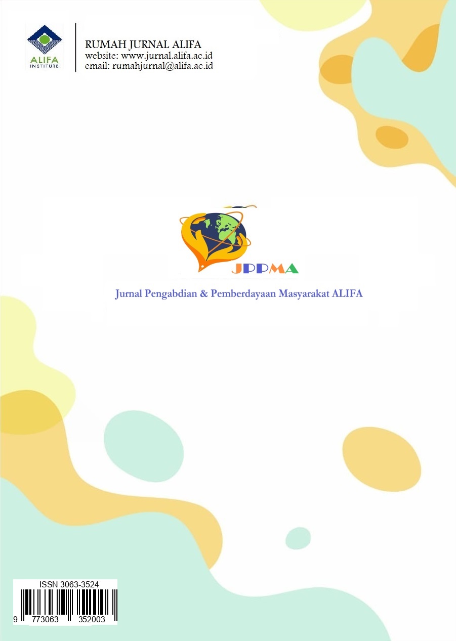 The ALIFA Community Service Journal (JPPMA) publishes the innovative works of lecturers and students in Indonesia in publishing products or reports from service-based research results such as Participatory Action Research (PAR), as well as other Service-Based Research. As a form of discovery and dissemination of science and technology to the wider community, especially rural communities and communities who need to improve their lives through sharing knowledge between teachers. ALIFA Community Service Journal (JPPMA) is a scientific service journal published by the ALIFA Research and Community Service Institute (UPPM).
